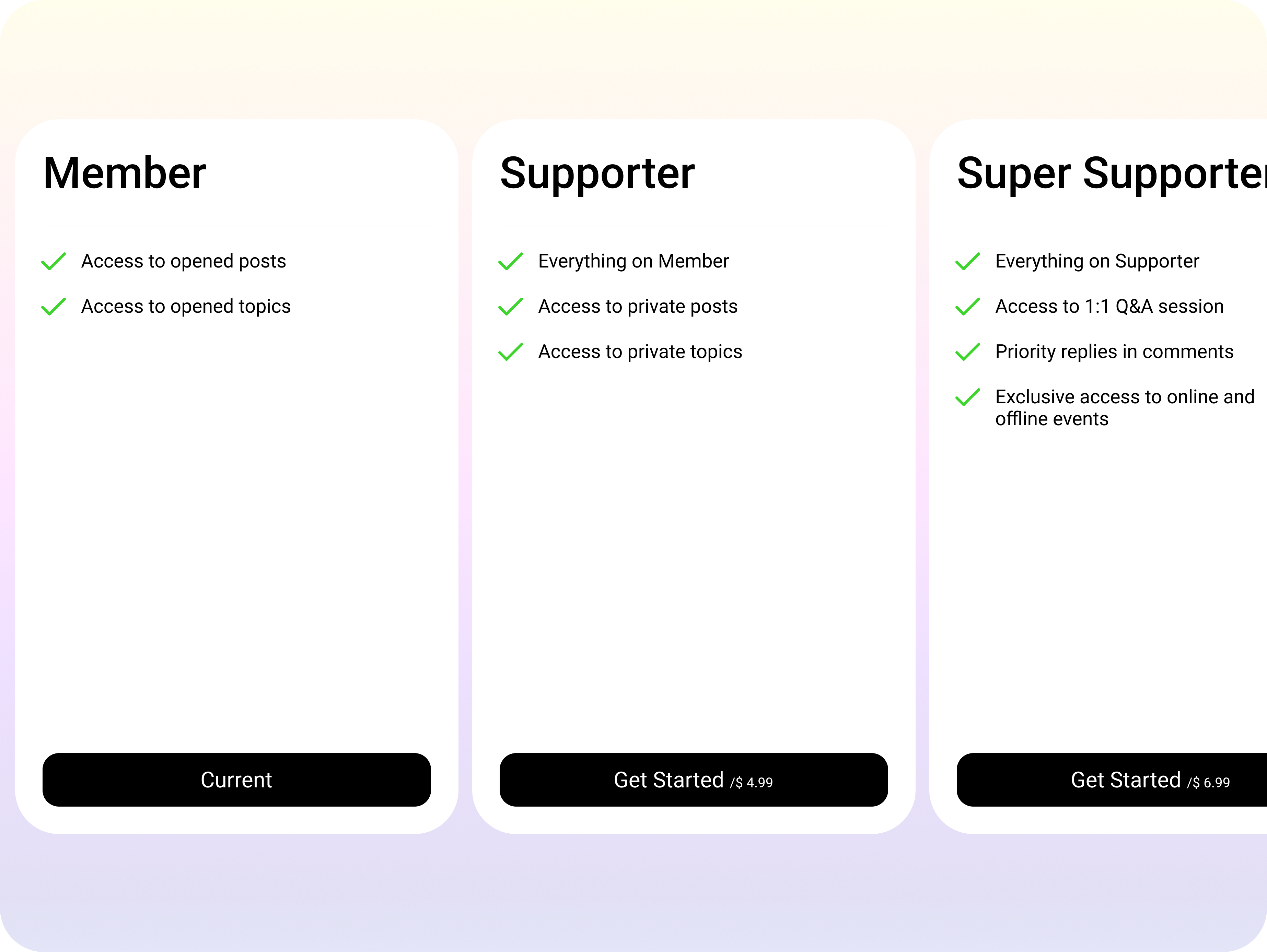 Create valuable contents and monetize your work by building your own subscription plans. Offer exclusive insights, resources, or experiences to your subscribers and grow a sustainable income stream.